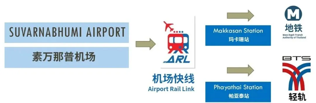 ① 选择机场快线ARL在Makkasan站换乘MRT、Phayathai站换乘BTS前往市区。