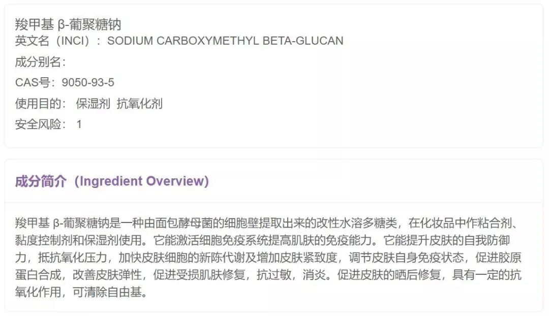 这是一种经典的免疫激活剂,它在抗炎症、伤口修复还有抗衰老等方面的高效功能都是被医学认证了的,添加在护肤品中能有效提高皮肤的抵抗力,而且还有长效保湿功能,又能加速胶原蛋白的合成,是个真正的好东西。