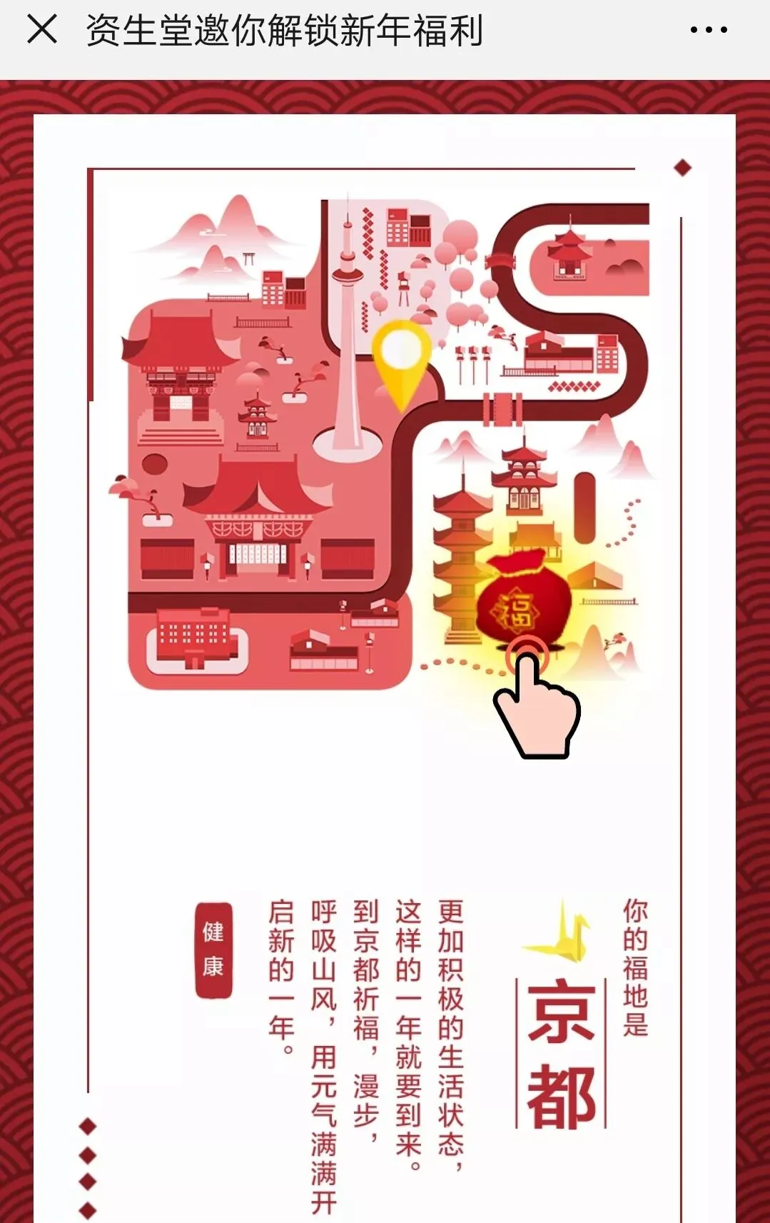 通过本文的原文链接点击进入后,摇签就能摇出新年福地(我哗啦啦摇了几大把,东京札幌京都大阪全都摇出来了);再点击图片上闪闪发光的福袋,就能知道你摇到了什么啦: