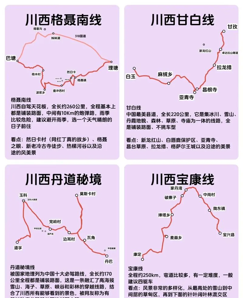 自驾是这条线的标准答案,自由换景,临停看云,路线建议10—14天,九寨沟进山两天,川主寺或黄龙半天,新都桥到亚丁三天,格聂南线两天,甘白路一天留机动,预算分三档:合租SUV人均4500—6500,自驾SUV人均7000—9000,带露营装备能再省一截,节庆别错过理塘赛马和康区跳神,工作日进沟更划算。