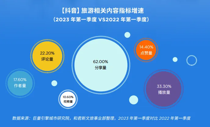 《白皮书》指出,作为旅游内容和传播的重要渠道,抖音平台2023年第一季度旅游相关内容指标均有不同程度的增长,意味着人们旅游需求大幅增长。其中,分享量同比增长62%,视频代替文字和图片成为分享的主要方式。