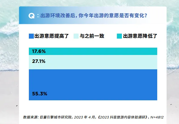 今年的“五一”假期,不论是省内还是跨省出游都很火爆。现象和数据都说明旅游行业加速复苏回暖。据巨量引擎城市研究院《2023 抖音旅游内容体验调研》显示,55.3%的被调研用户表示出游意愿有所提高,27.1%的被调研用户表示今年的出游计划与之前一致,总体出游意愿表现较为强烈。当问及2023年是否有出游计划时,超6成(67%)的用户表示今年会有出游计划。从需求端来看,旅游市场整体呈现出蓄待发的状态。