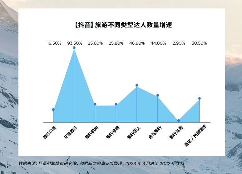 在过去,旅游信息获取途径更多来自于导游,而现在,旅游达人成为人们出游的指南针。旅游达人、明星直播带货,文旅局长花式出圈,在KOL的强势带动下,引发内容传播热潮。其中,旅游达人日益增强的影响力不容忽视。根据巨量引擎城市研究院数据,在规模方面,截至2023年3月31日,抖音旅游达人超3.8万人,同比增长30%(注:抖音旅游达人指发布旅游相关内容,粉丝量在一万及以上的创作者)。其中,增速最快的达人类型为环球旅行,增速高达93.5%,其次为旅行职人,之后是自驾旅行,分别为46.9%和44.8%。