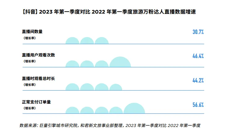抖音平台缩短了用户从种草到下单的链路。2023年第一季度,旅游万粉达人积极的开启直播,在直播中分享出游内容,直播间数量同比增长30.7%;用户也乐于观看旅游直播内容,观看次数同比增长46.4%;更重要的是,用户支付订单量同比增长56.6%,直播形式极大缩短了用户从种草到下单的链路。