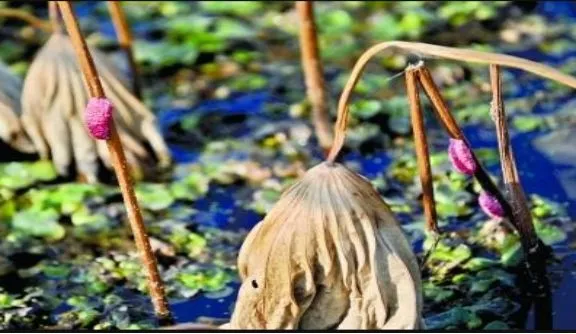 (荷叶杆上的红色附着物,就是谢女士怀疑的“福寿螺卵”)