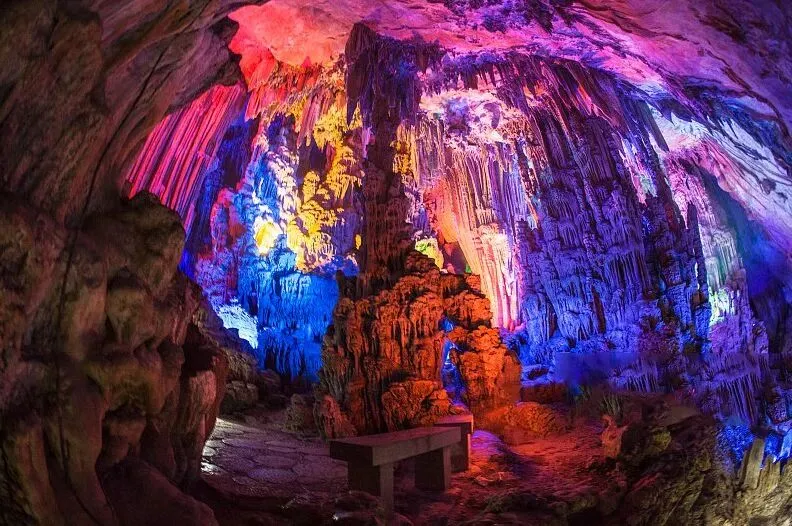 寻龙山主要以卡斯特地貌为主,其卧龙洞形成于两亿年前,是世界罕见、全国唯一的卡斯特地貌砾岩溶洞。伴着洞内诡谲的灯光,钟乳石的轮廓丰富多变,整个人都会陶醉到这光怪陆离的景象中。