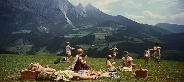 电影《音乐之声》中女教师与孩子们在草坪上野餐。