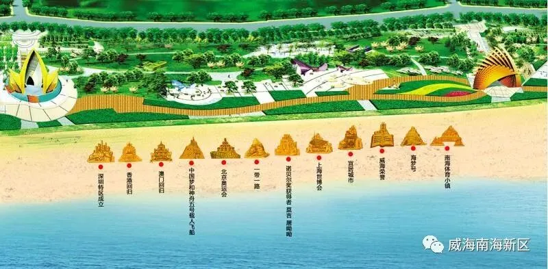 西区共有12座沙雕,展示了改革开放四十年来,中国社会发生的变化,以及威海建市以来的发展成果和威海南海新区开发建设以来取得的成绩。