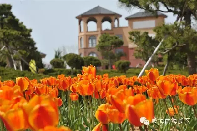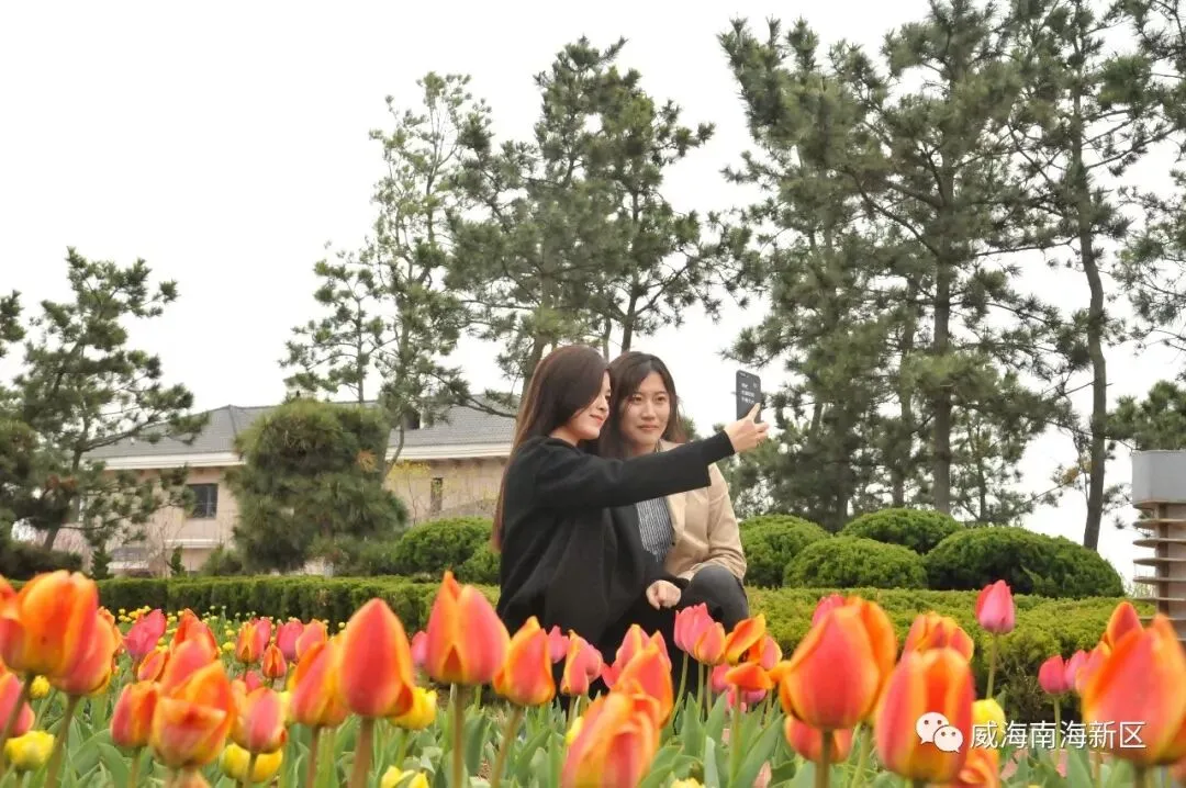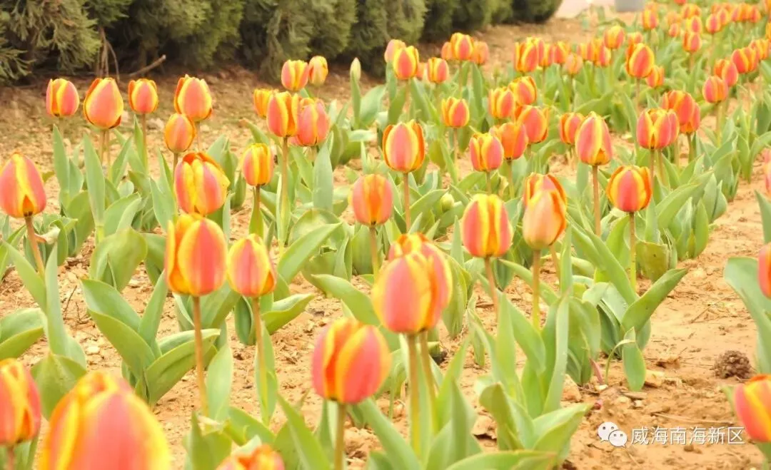 在威海南海新区海景路、香水河公园、蓝湖公园等地,红、黄、白、粉四大色系,近20个品种的荷兰郁金香争相绽放,天然营造出一片花海盛景,可徜徉花间栈道,可漫步林间戏水,可远观满园花海,可近赏花丛景石。大片郁金香犹如一幅幅异域风情的画卷,让人目不暇接,陶醉其中。