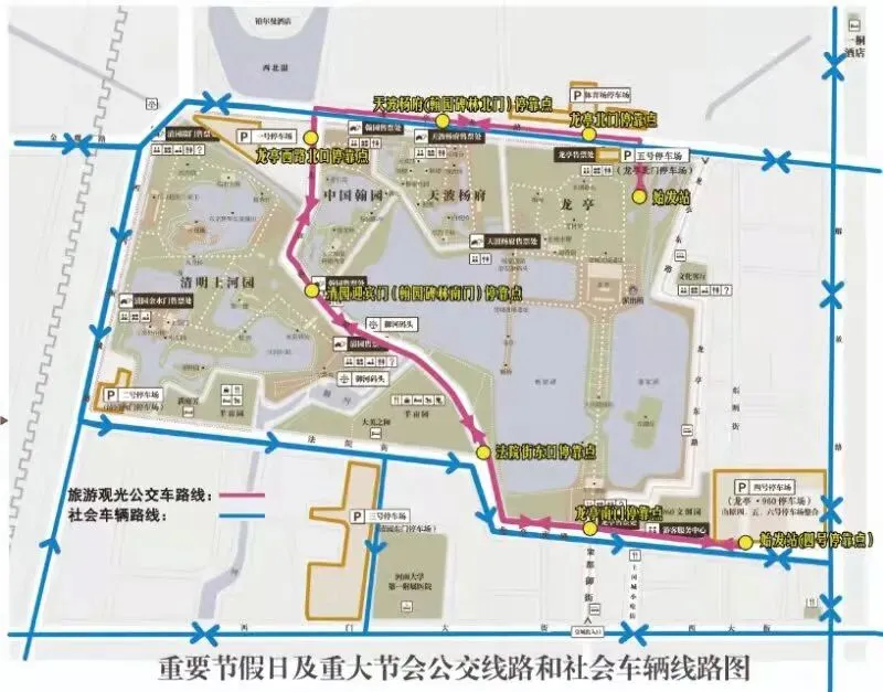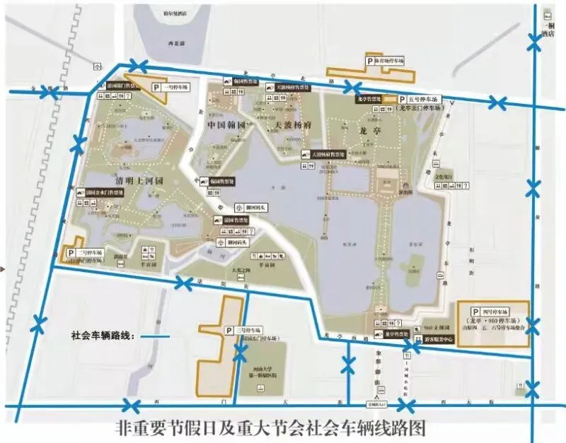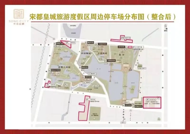 按照市委、市政府工作部署和统一要求,市直各相关单位、龙亭区政府、各企业单位、各景区要分工负责,各司其职,加强协调,精心组织,全力保障宋都皇城度假区内外道路交通安全、有序、畅通,切实增强外来游客和市民群众的舒心感和满意度。 (一)停车场整合和命名 为了方便游客识别停车场,将原来的2、3、4、5、6、7、8、9号进行整合和更改名称。原2号停车场名称更改为2号停车场(清园西门停车场),原3号停车场名称更改为3号停车场(清园东门停车场),因原4、5、6号停车场内部相通,将4、5、6号停车场进行合并,名称更改为4号停车场(龙亭·960停车场),原7号停车场名称更改为5号停车场(龙亭北门停车场),鉴于8号、9号停车场进行开发建设,不再考虑停车场功能。华北体育场停车场名称不变。 (二)皇城度假区地桩和隔离设置 取消法院街东口和刷绒街地桩。按照本次提升方案,地桩设置位置为: 禁止社会车辆在御街、龙亭西路(法院街—龙亭北路段)、龙亭东路通行。 (三)宋都皇城度假区旅游专线(重要节假日和重大节会期间运营) 1. 运营模式。由市文投公司、交运集团投入10辆左右中小型车辆(可根据交通情况酌情调整),重要节假日和重大节会期间开设宋都皇城度假区旅游专线,公交化运营,满足游客和市民在度假区内外的出行需求。 2. 运营路线。分别以4号停车场(龙亭·960停车场)和龙亭公园东侧公交车停车场为发车点,双向对发,解决游客往来度假区内各景点游览的交通保障问题。 具体线路为:4号停车场(龙亭·960停车场)—龙亭南门—法院街东口—清园迎宾门(翰园碑林南门)—龙亭西路北口—天波杨府(翰园碑林北门)—龙亭北门—龙亭公园东侧公交车停车场(原路返回)。 3. 运营时间。旅游专线车辆运营时间为8:00—21:30,发车时间为5—10分钟一班,客流高峰期合理调配发车时间、发车频次。 4. 票价。拟定为单程5元/次,10元不限次(当日有效),最终以物价部门审批为准。 5. 停靠点。停靠点原则上优先选择公交车站点及度假区内观光车原停靠点,同时在选定站点设置醒目标识。计划设置4号停车场(龙亭·960停车场)、龙亭南门、法院街东口、清园迎宾门(翰园碑林南门)、龙亭西路北口、天波杨府(翰园碑林北门)、龙亭北门等7个停靠站点,有效串联起度假区内各停车场及各景区的主要出入口。站点之外招手即停。 (四)社会车辆路线 1. 重要节假日和重大节会活动期间管控措施 (1)重要节假日包括每年“五一”“十一”和春节,重大节会活动包括清明文化节、菊花文化节等(重大节会活动管控期限另通知)。 (2)管控时间为7:30至21:30,其它时间正常通行。 (3)宋都御街、龙亭西路(法院街东口以北)、龙亭东路和樊楼西侧胡同进行交通管控,不允许社会车辆通行。 (4)西内顺城路与孝严寺街交叉口禁止向南、向北(只允许向东)通行。孝严寺街、法院街、龙亭南路、刷绒街(东明街口以西)禁止东向西通行。 (5)迎宾路与西门大街交叉口南向北禁止通行。 (6)社会车辆根据需求和沿线停车场停车情况选择停车场。交警部门在龙亭南门、刷绒街和东明街交叉口以及各停车场出入口等重点区域和道路沿线安排执勤,根据交通拥堵情况,灵活进行交通管控。 2.重要节假日和重大节会活动以外时段管控措施 除宋都御街、龙亭西路(法院街东口以北)、龙亭东路进行交通管控外,其他路段全部正常通行。 (五)度假区电瓶车线路 任何时段均可在度假区内运行。 本方案自2022年1月24日上午7时起施行。 开封市人民政府 2022年1月22日