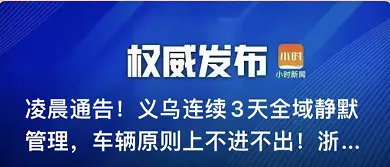 为进一步巩固前期防控成果,从8月11日零时起,义乌市已实行为期3天的临时性全域静默管理。当地要严格控制人员流动,严格实施硬核管控措施,静默期间非必要不出门,生产企业闭环管理,真正静下来,消除疫情扩散风险隐患。