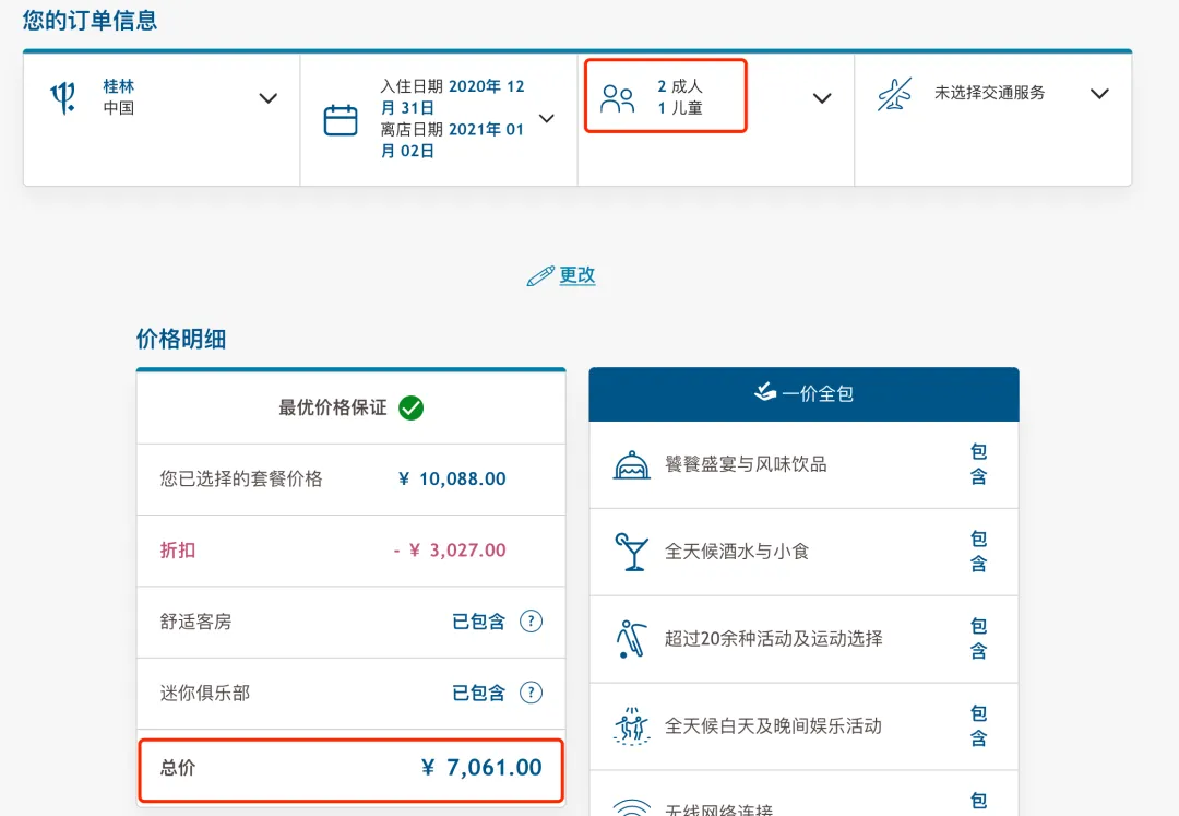 我们这次的价格真的是相当震撼,也是Club Med前所未有的优惠,大家有出行计划的一定不要错过了。随手比个价,这个是官网12月31日-1月2日桂林度假村两晚,2大1小的价格7061元,而我们这次团价是4288元。