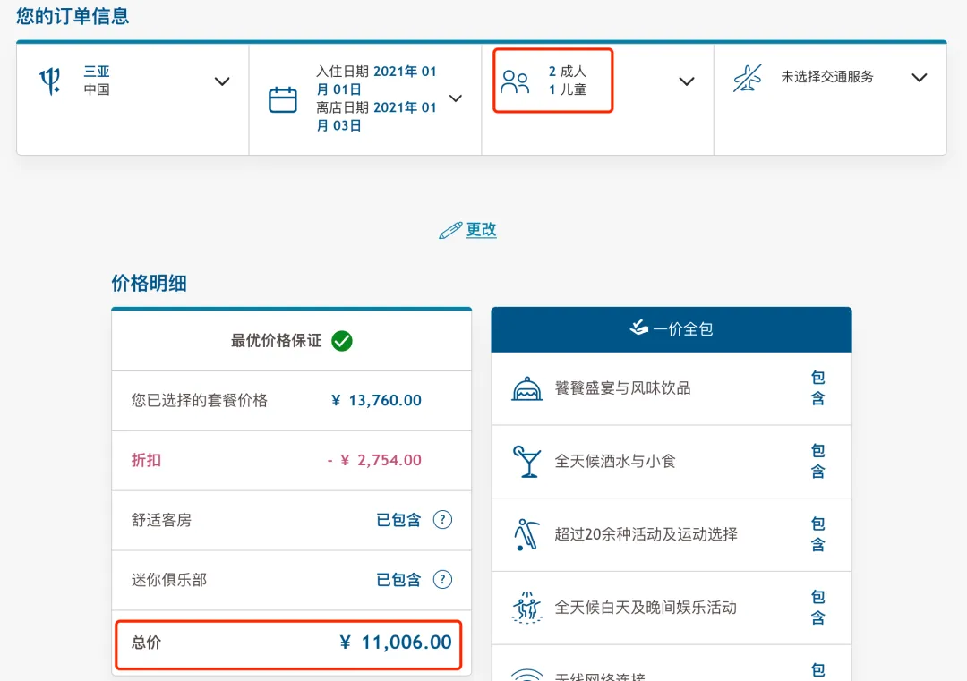 官网1月1日-1月3日三亚度假村两晚,2大1小的价格11006元,而我们这次团价是5588元。