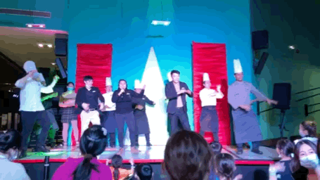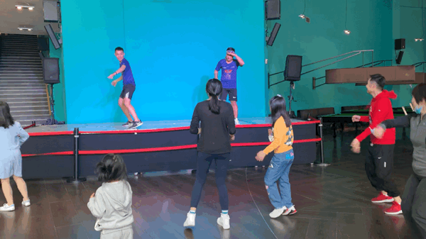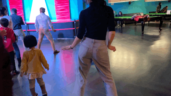 不但如此,每天中午11:30她都准时出现在吧台旁边的舞池中。上面两位G.O很会带动气氛,动作也不难,小朋友也可以轻松跟上,跟着跳完正好12:00去吃午饭。