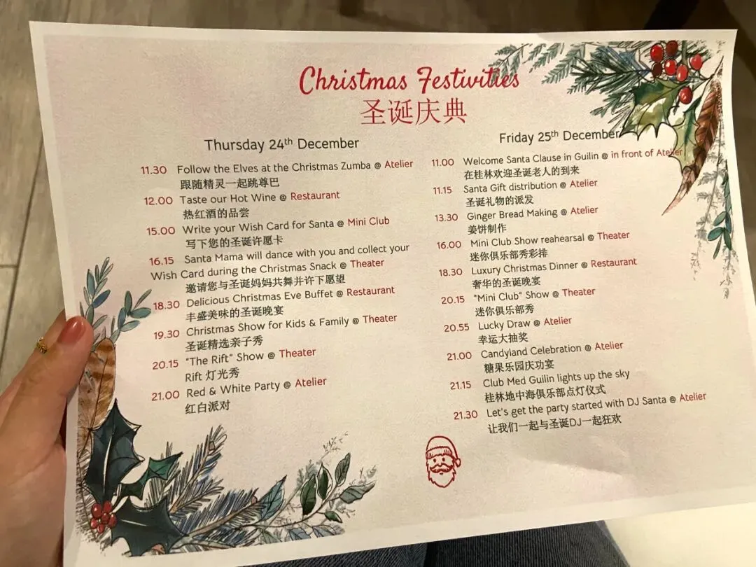 Club Med不适合以下人群: 1:喜欢安静、不爱动,度假只想躺平了在酒店休息的人 在Club Med里无论成人还是儿童的活动,虽然都是免费的,但一价全包,这些的成本肯定还是包含在里面的。如果完全躺平了什么都不参加,就有点划不来。 2:对酒店住宿和服务要求特别高的人 说实话,Club Med的客房真的太一般了,就是个睡觉的地方,三四星酒店的水准吧。房间内部和豪华品味ins美图那是不搭边的,所以真的不要对它有太大指望。服务方面,撇去其他酒店没有的G.O来讲,其他服务可以算得上不错,但如果你平常出行住的是文华东方、瑰丽、悦榕庄那个级别的酒店,可能要降低一下心理预期。凭良心说,某些场景下的服务还是差点意思,虽然服务水平还是水准之上的,但个别工作人员稍微缺乏一点服务意识,不懂变通比较死板,这个我得说实话,因为我自己是对酒店服务要求很高的人。 3:只喜欢看景点的人 我之所以会专门提这条,因为我爸就是这样的人。他去任何地方旅游,都一定要去当地最热门的景点,不然就感觉自己没去过。而Club Med主要是以酒店为圆心的玩乐形式,的确和传统旅行有区别。 三亚那家倒还好,因为三亚本身也没什么景点。像桂林这家我这次也给我爸妈买了,我就只买了2晚,想让他们再拼两晚市区或者景点附近的酒店,这样游览享受两不误。 4:单身旅行的人 其实不是说一个人旅行的人不适合住Club Med,而是这次团购没有匹配到单人的产品,双人价格更划算一些。所以如果不是夫妻、情侣或者带娃,拉上一个朋友闺蜜之类的一起旅行价格比较合适。 好啦,桂林Club Med就基本介绍到这里了。其实我们还有两天的假期没有结束,度假村里还有些项目没体验完呢。这两天又是圣诞节,活动格外丰富,这篇团文就是在圣诞大趴体的时候我在酒吧的小桌子上敲出来的。为了赶12月份的特价活动,以及为有元旦出行的读者提供选项,没办法只能赶快开团了。 这几天在桂林的吃吃喝喝记录和圣诞节Club Med精彩的活动,我争取下一篇再跟大家汇报。今天拍到了度假村里美好的夕阳,想要和你分享。 圣诞快乐!