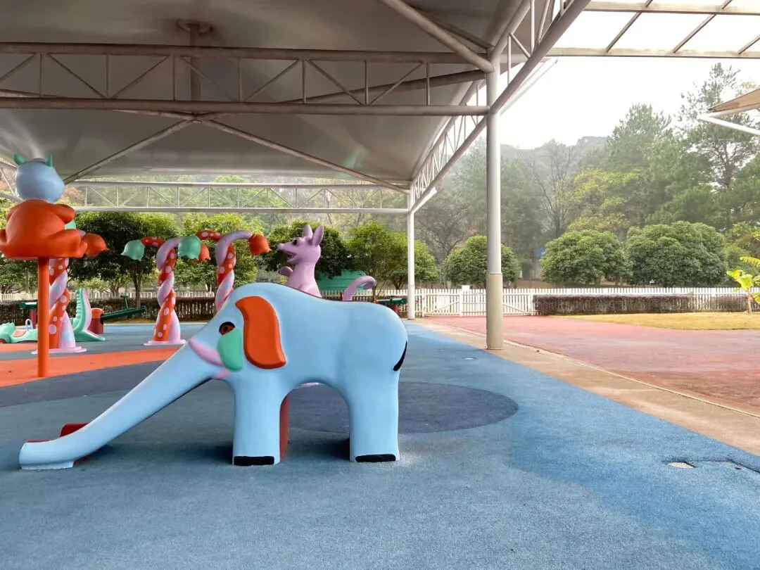 操场被迷雾中的群山包围,游乐设施很多足够小朋友们嬉笑打闹放够电量。