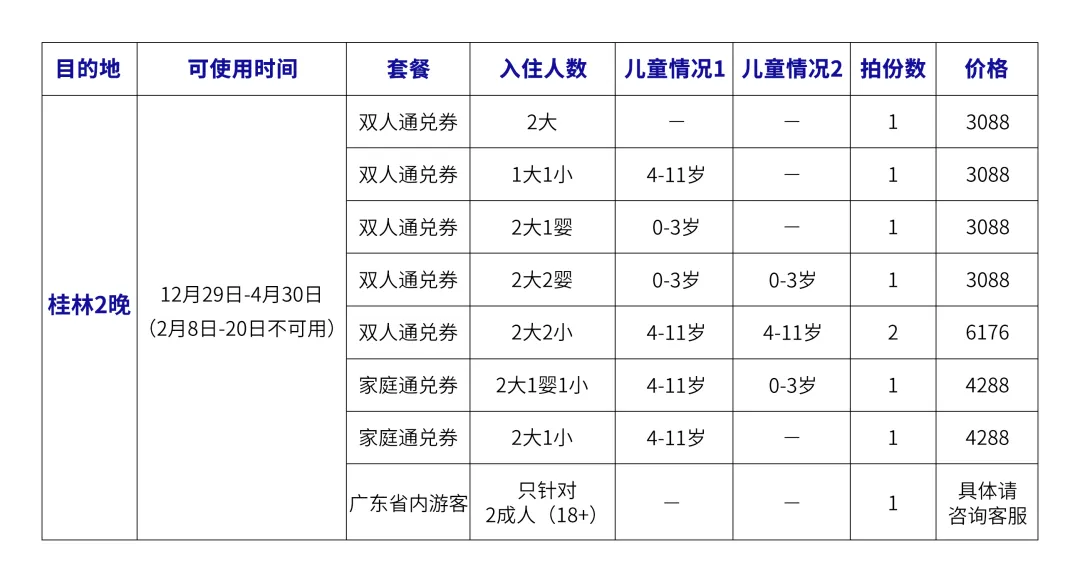 桂林2晚(多晚/多人可拍多份) 点击下面的表格图片即可购买桂林2晚优惠通兑券