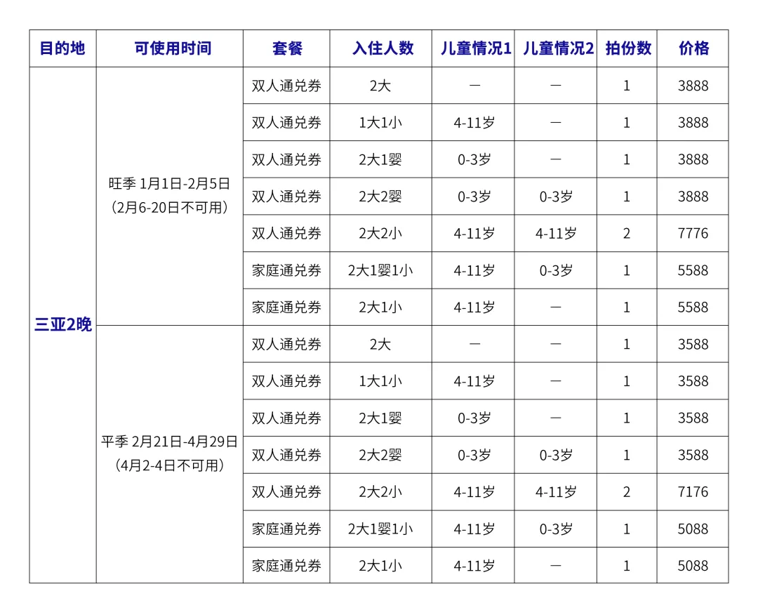 三亚2晚(多晚/多人可拍多份) 点击下面的表格图片即可购买三亚2晚优惠通兑券