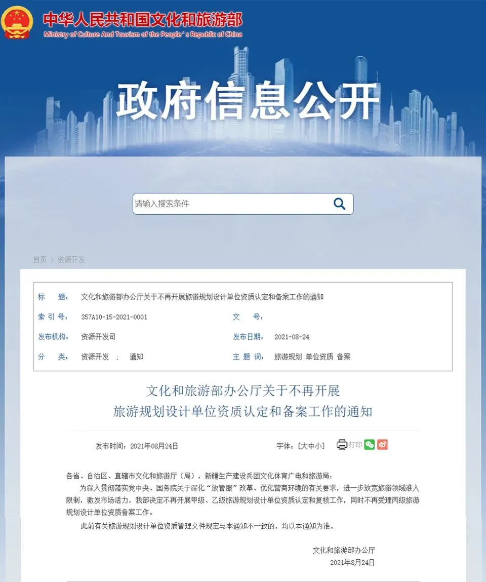 近日,文化和旅游部办公厅印发《关于不再开展旅游规划设计单位资质认定和备案工作的通知》,决定不再开展甲级、乙级旅游规划设计单位资质认定和复核工作,同时不再受理丙级旅游规划设计单位资质备案工作。