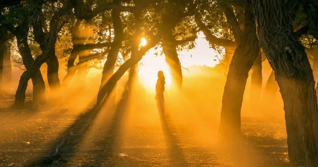 茂密的胡杨千奇百怪 每一棵树冠都仿佛一个金灿灿的火炬 满目金黄的树叶有种无限柔情 一阵秋风吹来,胡杨叶婆娑起舞 哗啦啦的声响格外动听 漫步在这里,仿佛进入神话般的仙境 这样震撼人心的美景和良好的光影条件