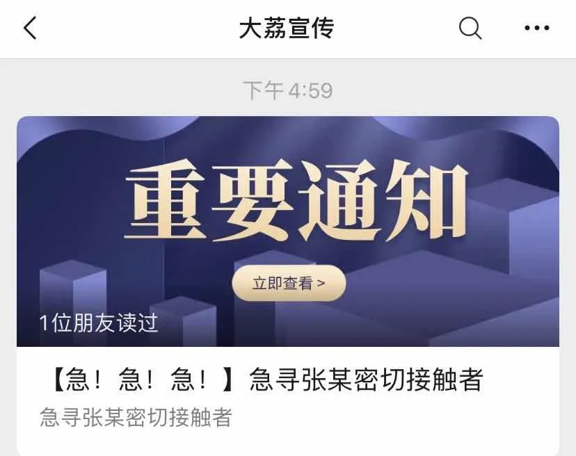 11月3日,陕西省渭南市大荔县委员会宣传部微信公号“大荔宣传”发布通告,大荔县人张某系新冠抗体阳性检测者的密切接触者,现急寻其密切接触者。