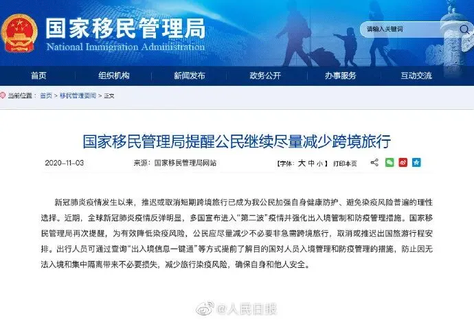 此外,国家移民局发布通知称,近期,全球新冠肺炎疫情反弹明显,多国宣布进入“第二波”疫情并强化出入境管制和防疫管理措施。