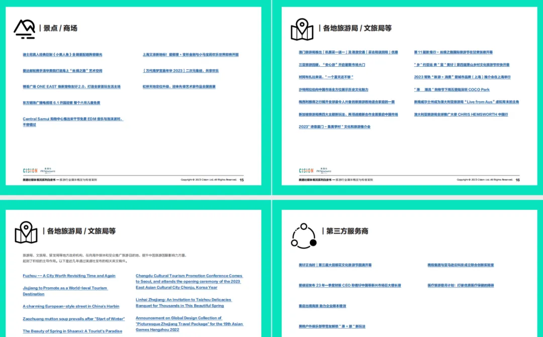 白皮书展示了:国内旅游媒体概况、媒体高层采访(媒体媒体对内容的偏好)、优质传播案例等内容,案例还覆盖了:各地政府/旅游局、酒店业、景区景点、出行、第三方服务等旅游类企业,是一份值得收藏与参考的内容。 旅游行业的部分国内媒体 通过对本白皮书内容的整理,我们发现旅游业品牌可尝试策划的一些话题方向: 而针对不同的旅游业垂类媒体,媒体主编们也在本次采访中讲述了其内容偏好。如: 环旅世界主编孙玉兰表示,目前该媒体更关注的内容话题包括:文化与旅游之间的相互影响、以及新冠疫情后,境外旅游如何快速地复苏发展起来。 品橙旅游主编金靖诺表示,品橙旅游目前更关注“未来12个月内,旅游行业能否恢复正常”这一话题。同时,还希望看到旅游品牌能推出新产品或者结合旅游新趋势的传播内容。 执惠主编李海强表示,会关注国际航班量增长和国际邮轮的相关新闻,以及海外旅游局中国市场推广等出境游话题,也会持续关注淄博烧烤能否延续火爆,以及有无成功的相似案例,还会关注上市旅游企业(景区、酒店、旅行社、文旅集团等)财报及重大热点新闻。 旅游行业的部分案例 此外,白皮书还盘点了数十篇优质的旅游业新闻传播案例,覆盖各类旅游企业、机构以及传播场景,欢迎点击文末“阅读原文”下载。