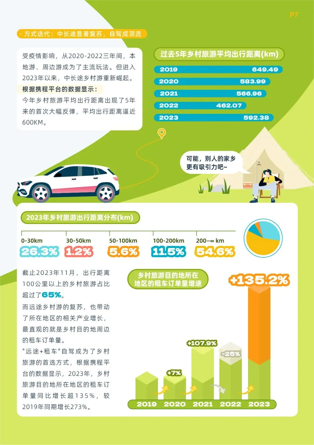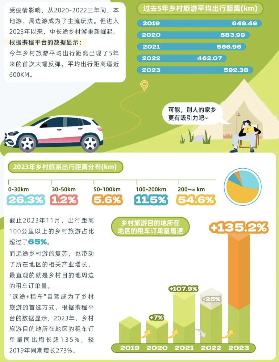 另外,“远程+自驾”成了乡村旅游的首选方式,根据携程平台数据显示,2023年乡村旅游目的地所在地区的租车订单量同比增长超135%,较2019年同期增长273%。