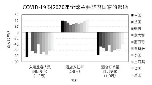 图 4 2020 年新冠疫情对全球主要旅游国家的影响(数据来源:UNWTO) 中国出境旅游市场收缩,显著影响国际旅游经济景气。受疫情影响,中国出境旅游市场急 速萎缩。由于亚太地区多个国家旅游市场有显著的中国化倾向,其当地的航空公司、旅行社、 住宿业、餐饮业、租车服务等行业的收入严重依赖中国游客的消费支出。新冠疫情爆发后,中国游客锐减,当地旅游业生存艰难,多家旅行社、酒店、餐馆陷入经营困境。主要目的地中国 澳门地区、泰国、日本、韩国等地旅游业遭受重创。数据显示,2020年新冠肺炎疫情暴发后, 中国澳门地区入境旅客由1月份的285万人次锐减至3月份的21万人次,跌幅超过九成以上。泰国旅游局(TAT)公布的预测数据,受新冠肺炎疫情影响,今年赴泰国旅游的中国游客可能 会减少60%0日本NHK电视台4月16日报道,日本旅游业因疫情受到沉重打击,中国游客 的消费额同比减少了 44%,为2348亿日元(约合人民币154亿元)。济州旅游协会消息称, 2月1日至3月1日访问韩国济州岛中国游客仅为4355人次,同比减少94%。 2. 稳步的复苏 主要国家国内旅游不同程度走向复工复产复业新阶段。新冠疫情对全球各个国家旅游业 的影响存在程度上的差异,各个国家的疫情应对和旅游业的影响也存在差异,但自6月以来, 都不同程度走向了稳步复工复产(图5) o中国旅游经济依托国内超级大市场,已经进入疫情 防控常态情境下全面复工复产复业新阶段,仅国庆节、中秋节八天,中国共接待国内游客6.37 亿人次,按可比口径同比恢复79.0%,实现国内旅游收入4665.6亿元,按可比口径同比恢复 69.9%,与端午节假期相比,恢复进度分别提高了 28个和39个百分点,中国旅游经济稳中向 好的基本面进一步稳固。奥地利旅游小镇哈尔施塔特6月中旬以来很多酒店重新开业,预订量 不断增加,迎来了酒店和停车场游客爆满的场景,除了本土游客,来自德国、匈牙利等周边国 家的游客比例也越来越大。法国一些地区夏季游客总人数较去年有所增加,有的地方甚至达到 10%以上的增长率。马来西亚6月份客房总体预订量与2019年相比增长了接近190%。