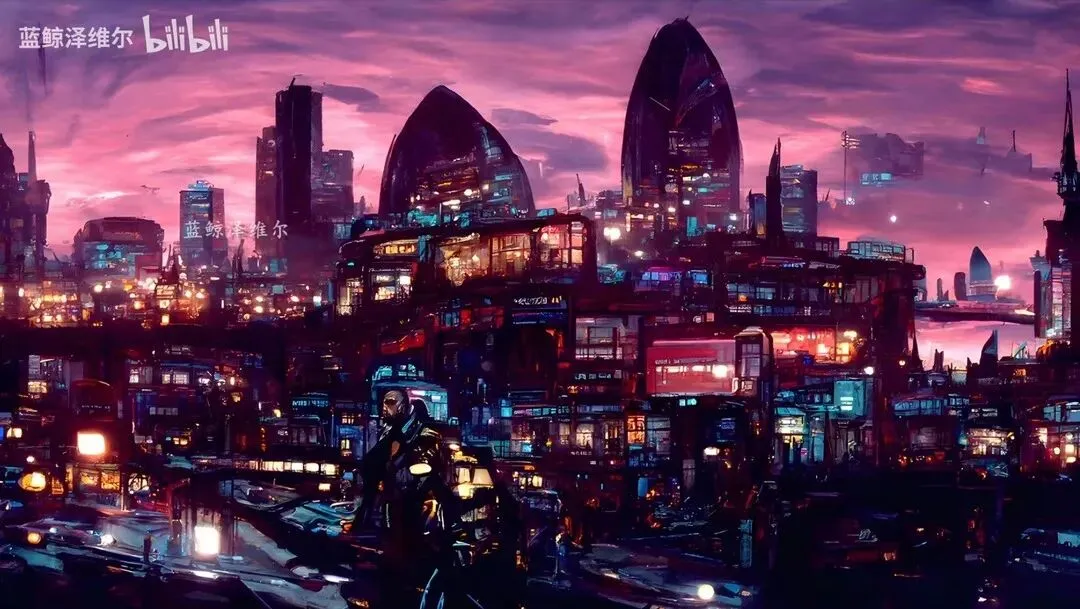 B站用户“蓝鲸泽维尔”用AI绘画创造出的赛博朋克城市