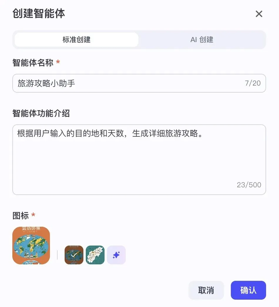 新建一个智能体,填写好智能体名称和功能介绍,设定好图标。