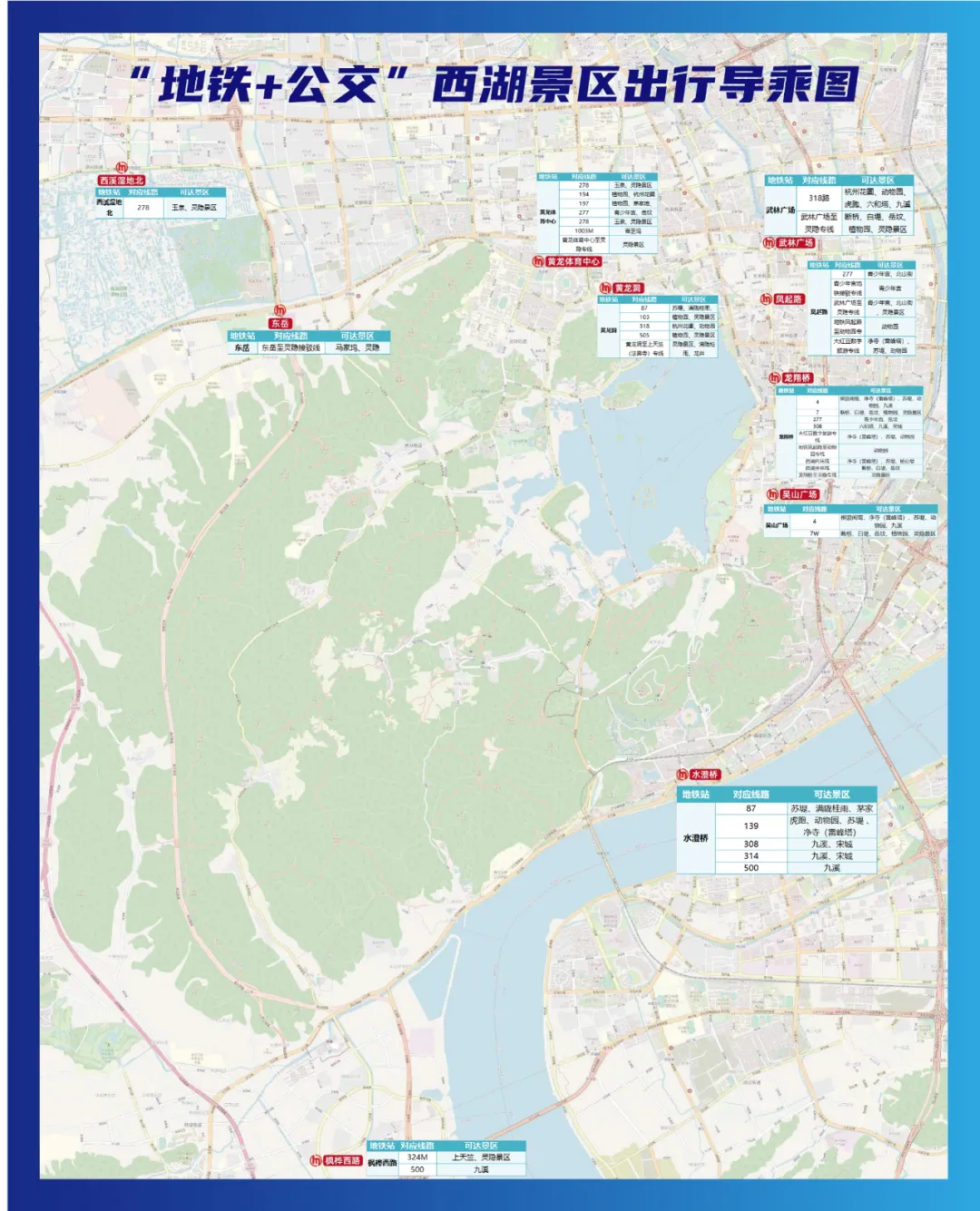 西湖西线(云栖竹径、宋城、九溪、之江等)、小牙坞出租车网约车临时换乘点的游客可乘坐103路、121路、324M路、1314路;梅灵北路出租车网约车临时换乘点可乘坐103路、1314路;西湖北线(黄龙洞)可乘坐黄龙洞至上天竺专线;西湖南线(一公园、柳浪闻莺、雷峰塔、花港观鱼等)可乘坐1314路,利用灵隐东、中天竺、上天竺公交站进出灵隐景区。