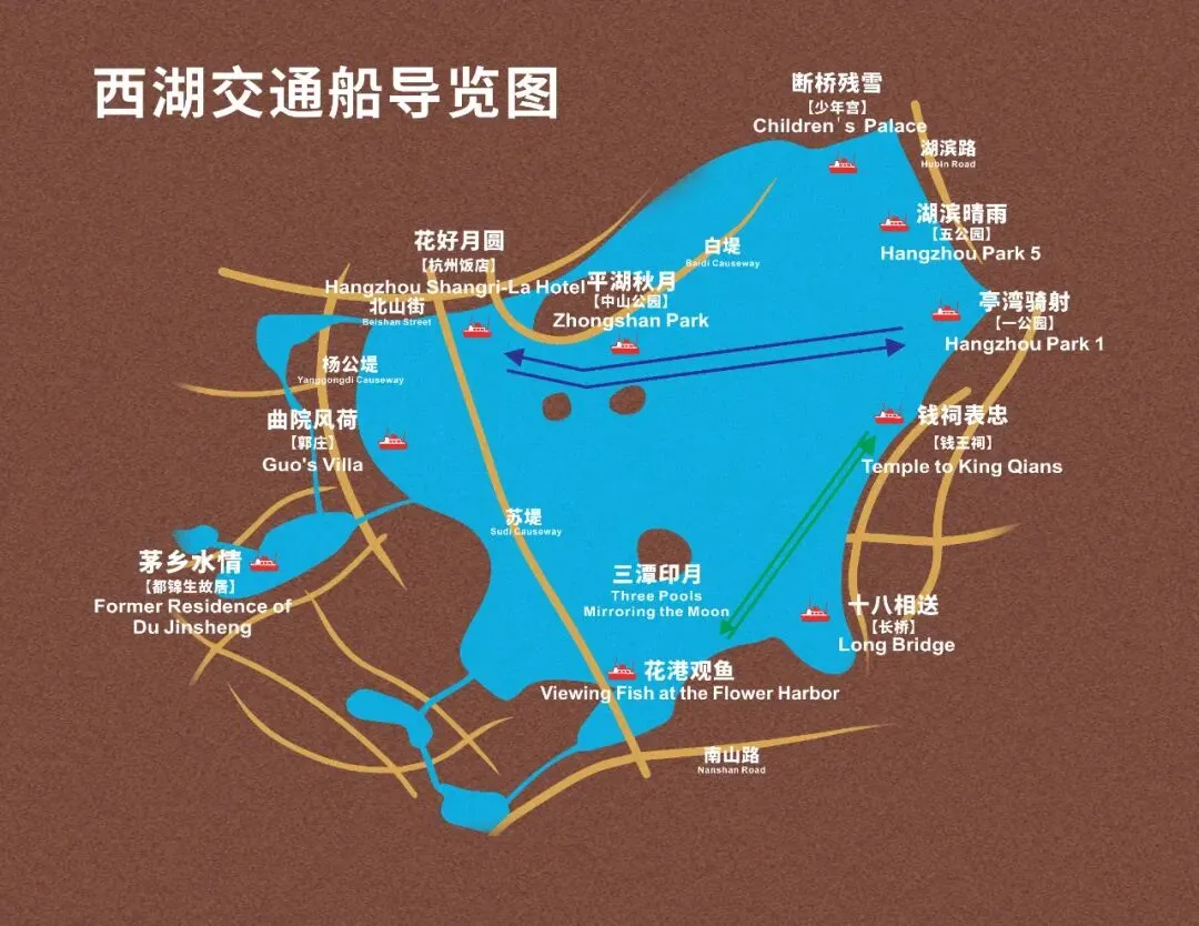 售票及乘船码头:一公园、五公园、少年宫、中山公园、杭州饭店、隐秀桥、都锦生、花港观鱼、水南半隐、钱王祠。