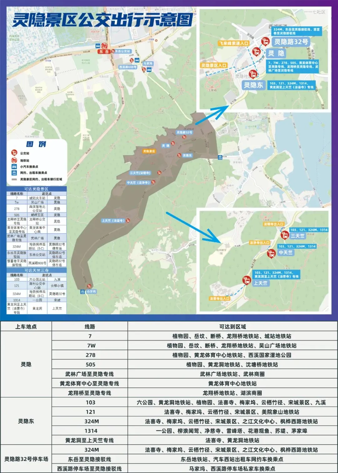 龙翔桥(地铁1号线)、黄龙体育中心(地铁3号线、10号线)、黄龙洞(地铁3号线)、东岳(地铁3号线)等地铁站均将开行直达灵隐的地铁接驳专线,前往灵隐景区的7路、505路、1314路等公交普线的频次也将大幅加密。具体出行建议如下: