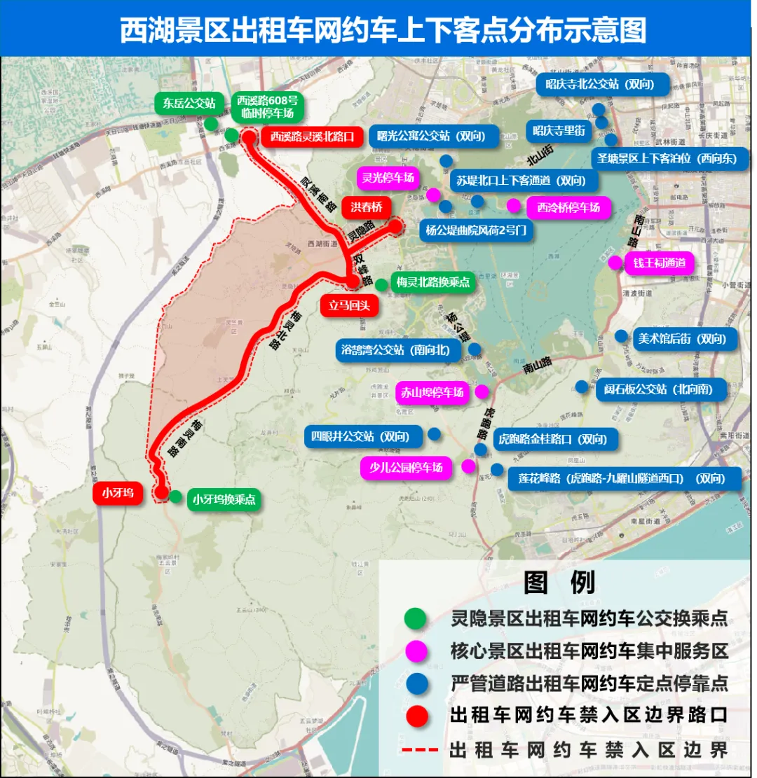 假日期间,在西湖北线设置西泠桥停车场、灵光停车场,西湖南线设置赤山埠停车场、少儿公园停车场,西湖东线设置钱王祠通道等5处上下客集中服务区,为司机和游客提供集中服务;在北山街、杨公堤、南山路、虎跑路、灵隐路、梅灵北路等严管道路及周边配套设置12处出租车、网约车定点停靠点。