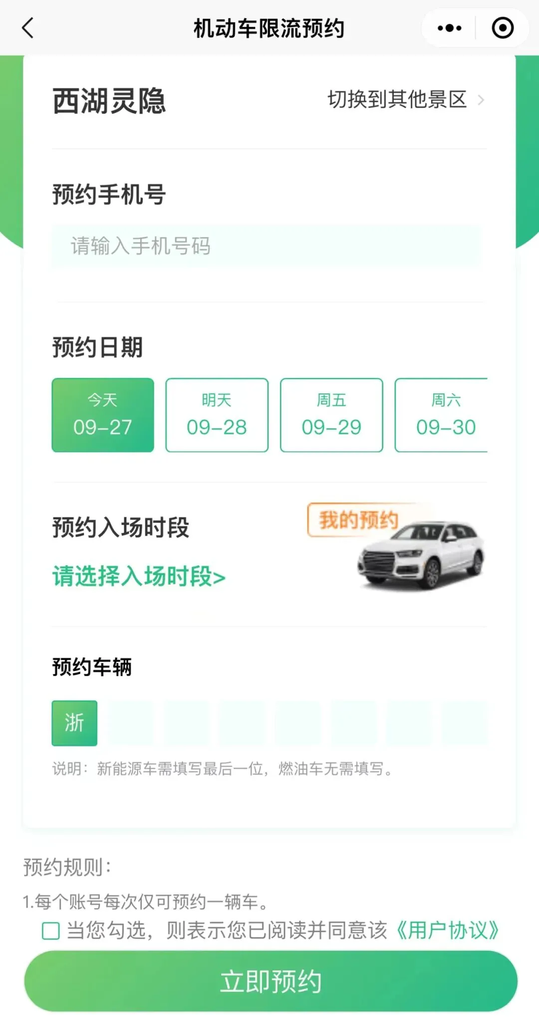 “西湖智慧出行”小程序灵隐车辆预约界面