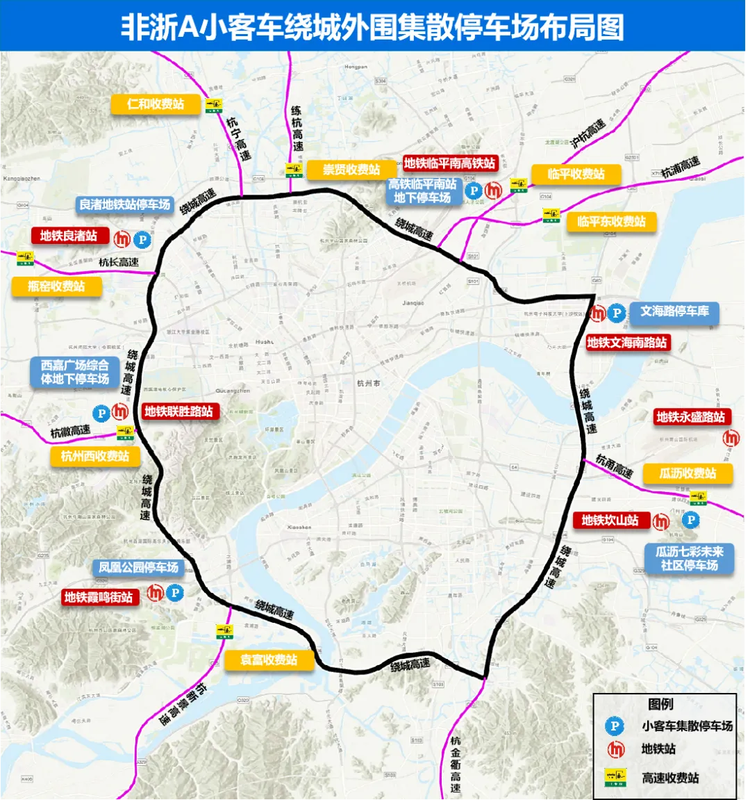 假日期间,建议自驾前往西湖景区的外地游客将车辆停放在绕城周边或“亚运核心圈”外围的停车场,通过换乘公共交通的方式进入景区。绕城外围可利用西嘉广场综合体地下停车场、良渚地铁站停车场、高铁临平南站停车场、瓜沥七彩未来社区停车场、文海路停车库、凤凰公园停车场等绕城外围6处非浙A小客车临时停车场,换乘地铁进入景区。通过申领“急事通”进入杭州绕城内部的小客车,可在“亚运核心圈”(钱塘快速路、空港高架、通城高架、彩虹快速路、紫之隧道围合区域)以外的区域自行选择停车换乘公共交通或其他方式进入西湖景区。