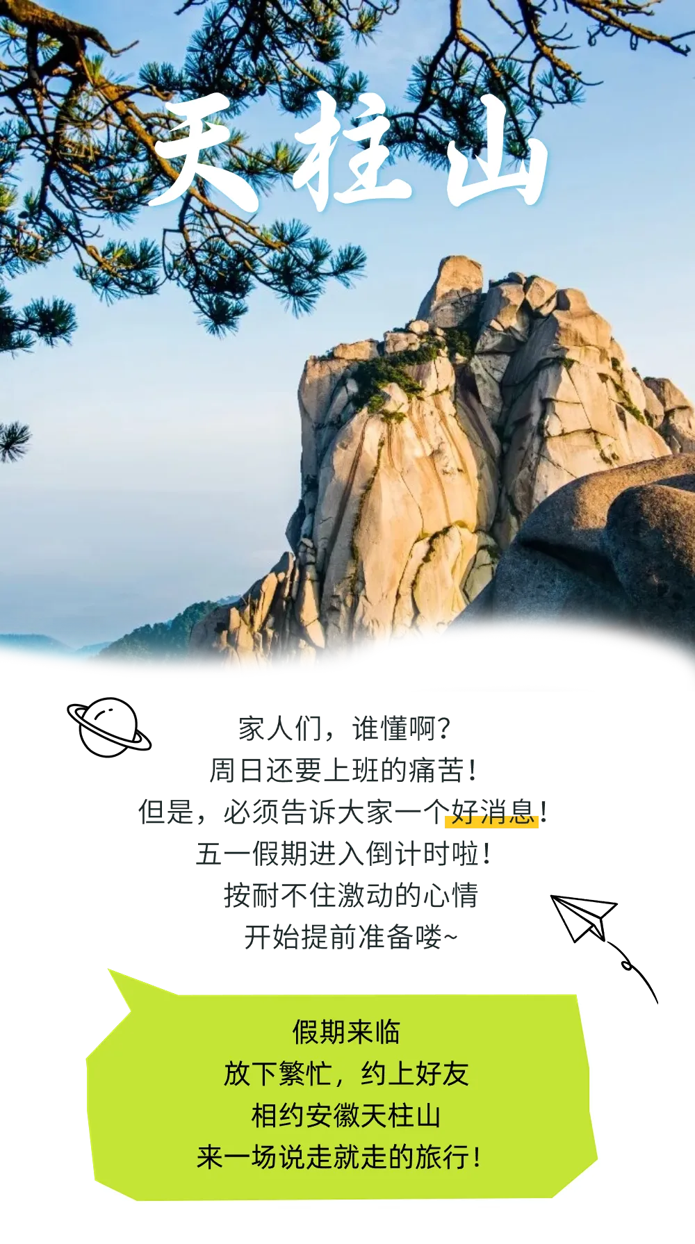 五一假期,让我们暂时告别城市的喧嚣,邂逅天柱山,投入大自然的怀抱,享受这份宁静与自由。