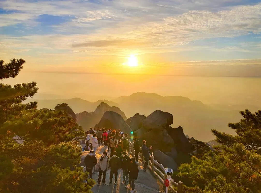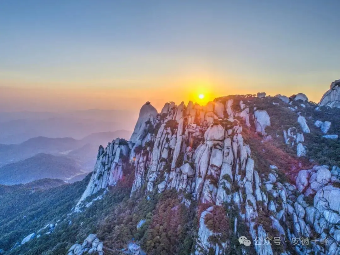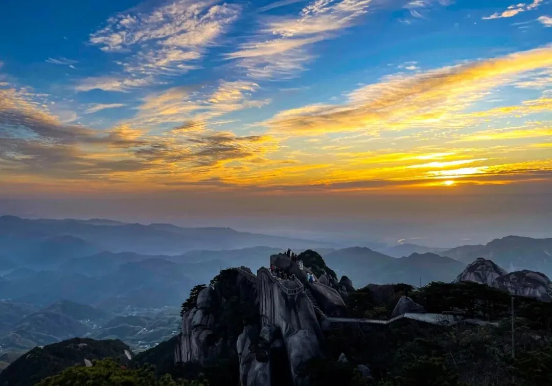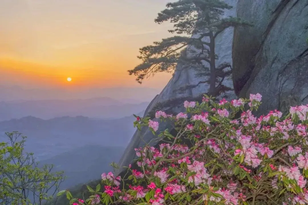 莲花峰峰顶岩石开裂,如莲花怒放,形状奇特,雄奇灵秀。在朝阳的光晕下,又彷佛绽开了五色花瓣,置身于此宛若天宫仙境。