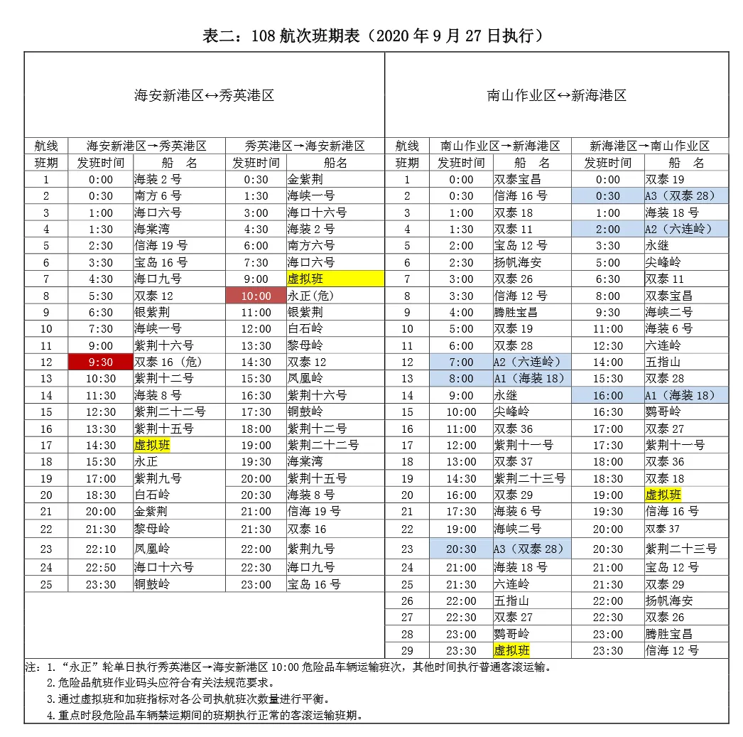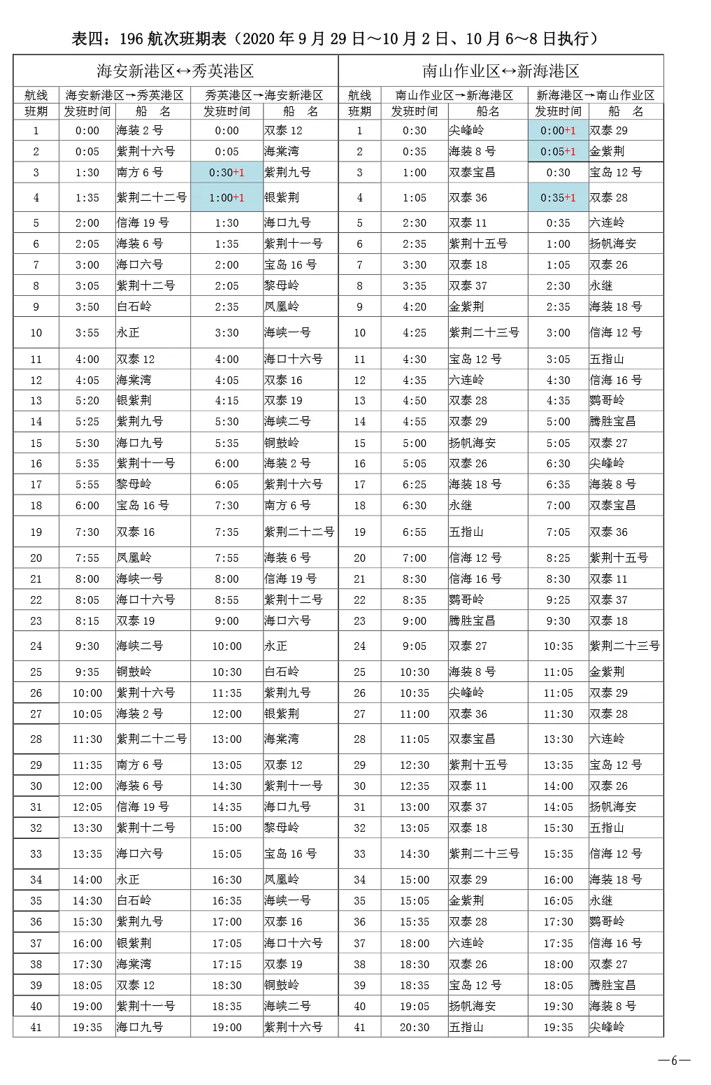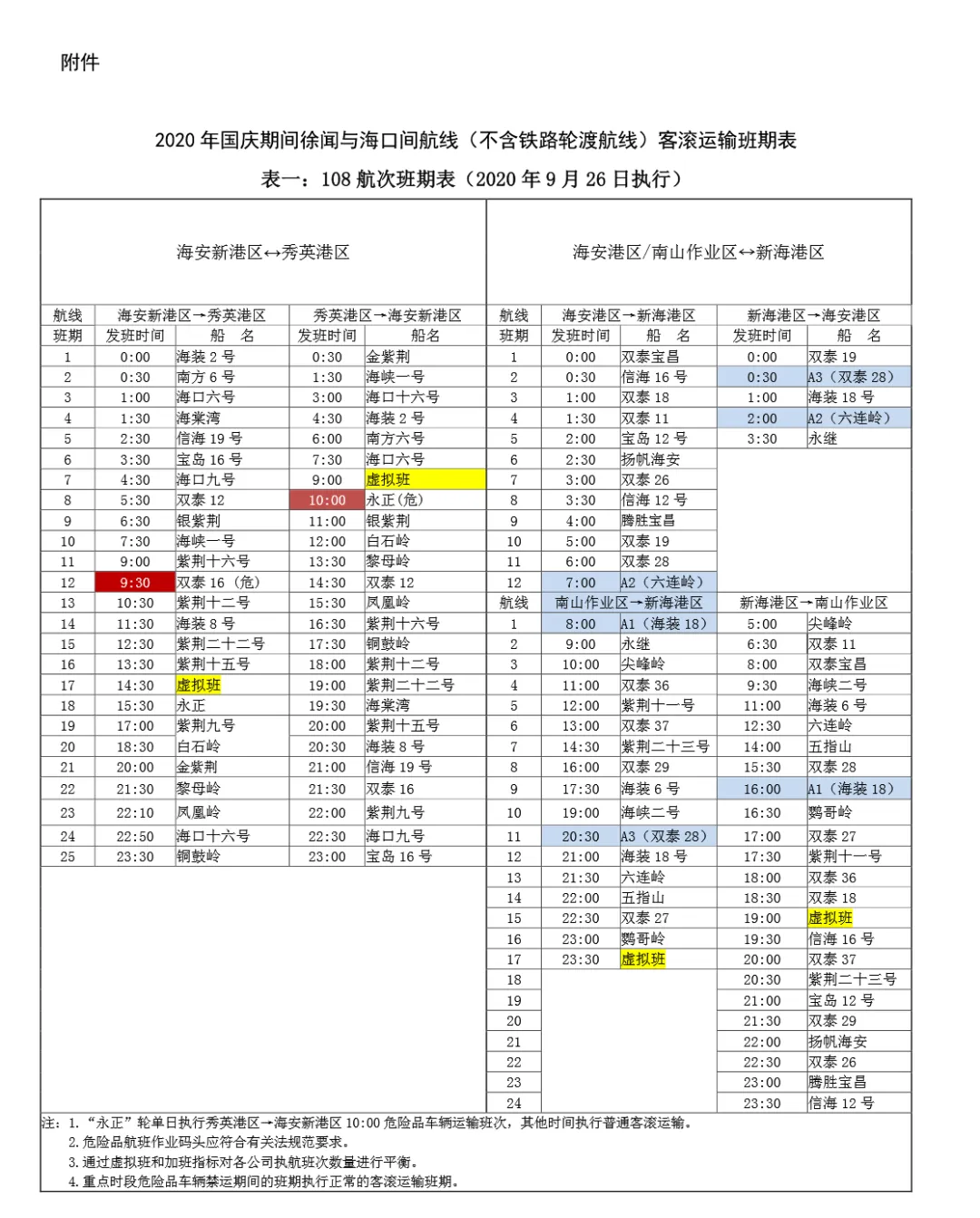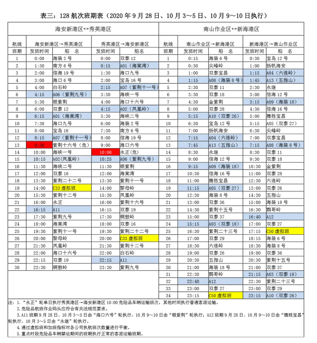此班期表仅供参考,具体以“琼州海峡轮渡管家”微信公众号公布的班期表为准。2020年10月11日及以后的班期表,将根据徐闻港南山作业区试运行情况另行通知。