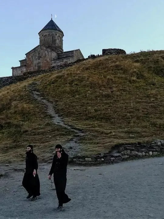 ▲格鲁吉亚,卡兹别吉雪山下的14世纪Gergeti Trinity教堂。“夜幕降临,月亮爬上十字架,刚好两名修道士出现,我用手机拍下了这个画面。”