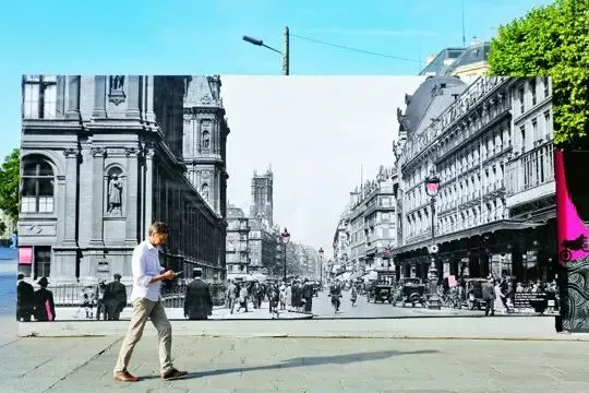 ▲巴黎,市政厅门前的一场摄影展,其中一幅作品呈现了1930年巴黎市政厅门前里沃利街的景象。“当我正在看这幅照片时,刚好一个男人进入到我的视线。”