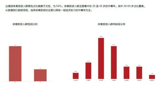 数据显示,选择体育旅游的人群基本集中在30-45岁的中青年。整体上最受青睐的体育项目包括马拉松和足球。其中,男性更青睐马拉松、足球、滑雪;而女性则更为关注马拉松、滑雪和网球等项目。