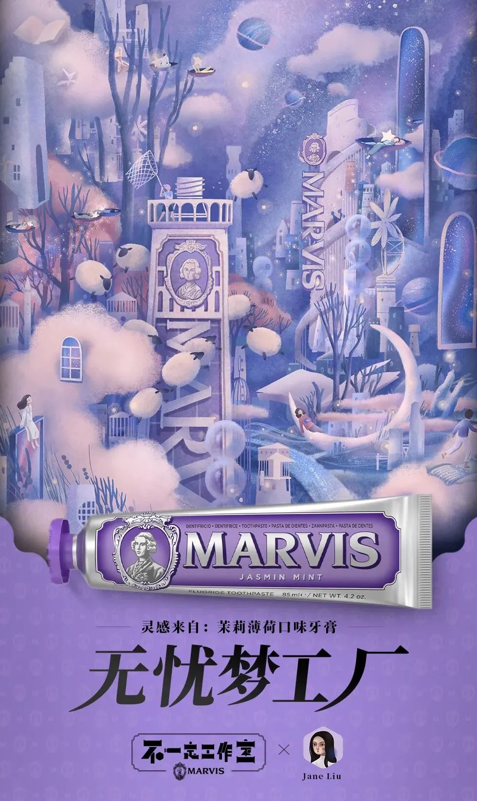 《无忧梦工厂》则是一个与梦境有关的幻想世界,紫色的颜色基调让这里充满着芳疗感的治愈氛围,就好像一个抵御世俗烦恼的乌托邦,一切安眠都能带来好梦,任何焦虑不安都能被一扫而空。灵感则来源于紫色的Marvis茉莉薄荷牙膏,茉莉花香气很好中和了薄荷的刺激感,柔和的口味很适合在每晚睡觉前使用,舒缓神经,帮助你更好的入睡。
