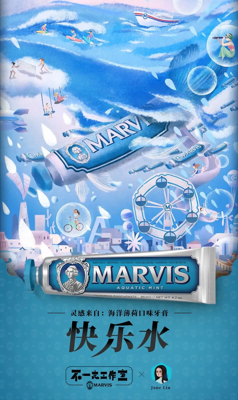 就好像最近我看到的青海湖湖面的那种湛蓝,《快乐水》的世界的天空中有一片快乐之海,既能吸收变成水蒸气的快乐,又能让快乐像下雨一样落回地面,当快乐无限循环于海与城市间,这个世界便永远不会缺少快乐。灵感来源于蓝色的Marvis海洋薄荷牙膏,淡雅的冷调薄荷,让你就像在大海边一般,轻而易举就能拾起最简单的快乐。