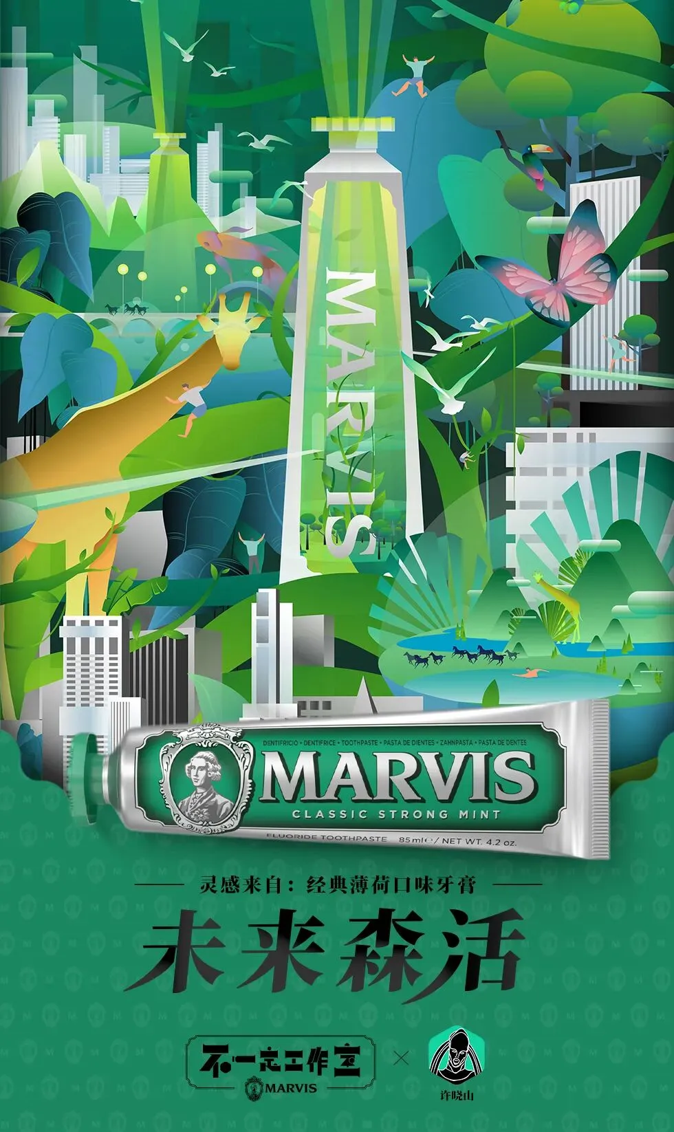 从森林开始,画作《未来森活》就描绘了一个绿色世界,这里的生活与自然和植物息息相关,自然与城市的界限已不再明显,甚至动物都成为了生活中擦肩而过的朋友,灵感来自于绿色的Marvis经典薄荷牙膏,强力而清新的薄荷口味,给生活注入了活力的同时具有非常有辨识度的香气。