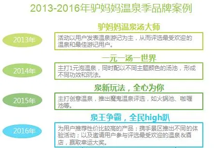 驴妈妈CEO王小松表示,驴妈妈每年秋冬季节都会联合全国温泉景区、酒店发起温泉季主题活动,获得游客广泛好评,驴妈妈目前已成为温泉旅游领军品牌。白皮书中显示,从2013年的“温泉汤大师”到2016年的“泉王争霸,全民high趴”,驴妈妈活动形式更加丰富多样,为温泉旅游增添了更多的乐趣。2016年12月31日,驴妈妈联合行业十大品牌和两大意见领袖,共同做了温泉盘点,以“2016又泡汤了?管他呢!先泡个温泉再说!”为主题的海报联合推广,营造出“不管2016怎么样,先泡个温泉”的约“泡”氛围,在游客中反响热烈。