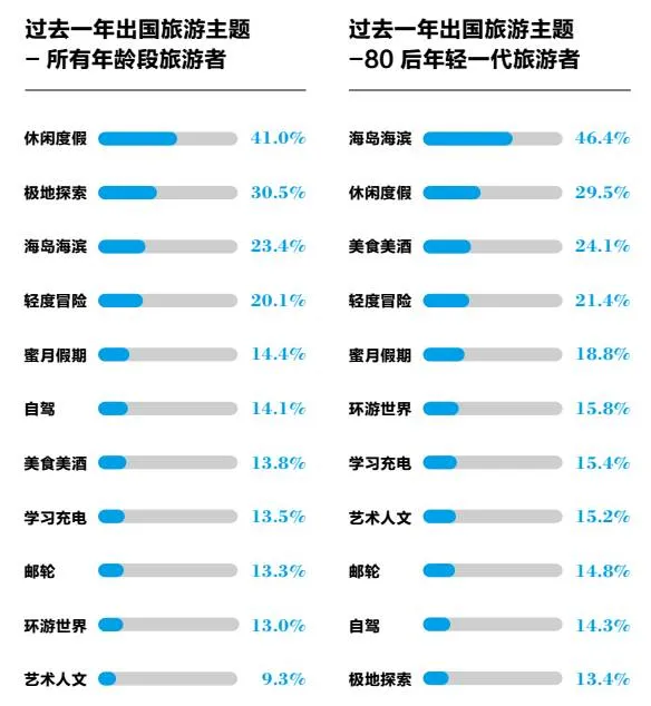 海岛海滨成为去年出国旅游最大黑马。过去一年中国高端旅游者出国旅游依然以休闲度假为主,占41%。极地探索和轻度冒险延续了过去两年的强劲势头,位列第二(31%)和第四(20%)。海岛海滨作为今年调查的新选项成为中国高端旅游者过去一年出国旅游主题的大黑马,以23%的占比超越邮轮(13%)和自驾(14%)等传统旅行项目位列第三。在80后年轻一代中,海岛海滨度假更是成为最热主题,以接近一半的比例(46%)排名第一。