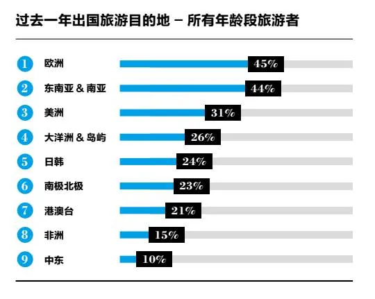 值得注意的是 80 后年轻一代旅游者对于非洲和极地的渴望在逐步增加,相比于去年的 23% 和 17%,