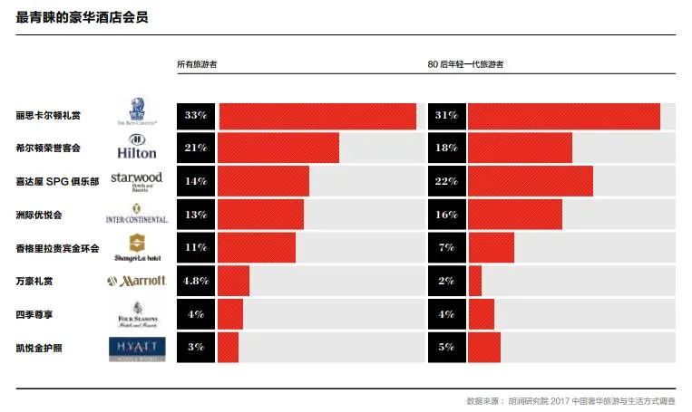 高端旅游者办理酒店会员最多的也是丽思卡尔顿,相比两年前,丽思卡尔顿的受青睐程度增加了19%,从希尔顿手上夺过了头把交椅。万豪则从两年前的第二下降到了第六。胡润表示:“相对于航空公司的会员,酒店行业的会员价值相对没那么高。”